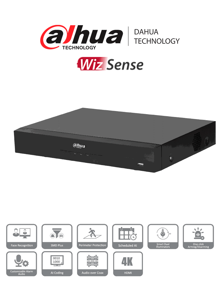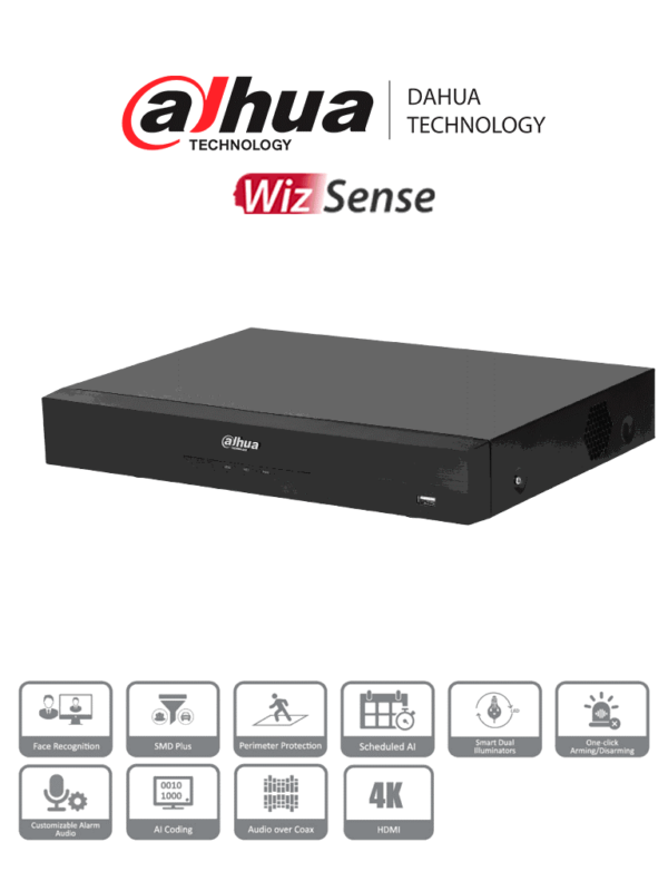 DAHUA DH-XVR5104HE-4KL-I3 – DVR de 4 Canales 4k/ WizSense/ H.265+/ 4 Canales IP Adicionales/ Hasta 8 Canales IP/ 1 Canal de Reconocimiento Facial/ SMD Plus/ E&S de Alarmas/ 1 Bahía de Disco Duro
